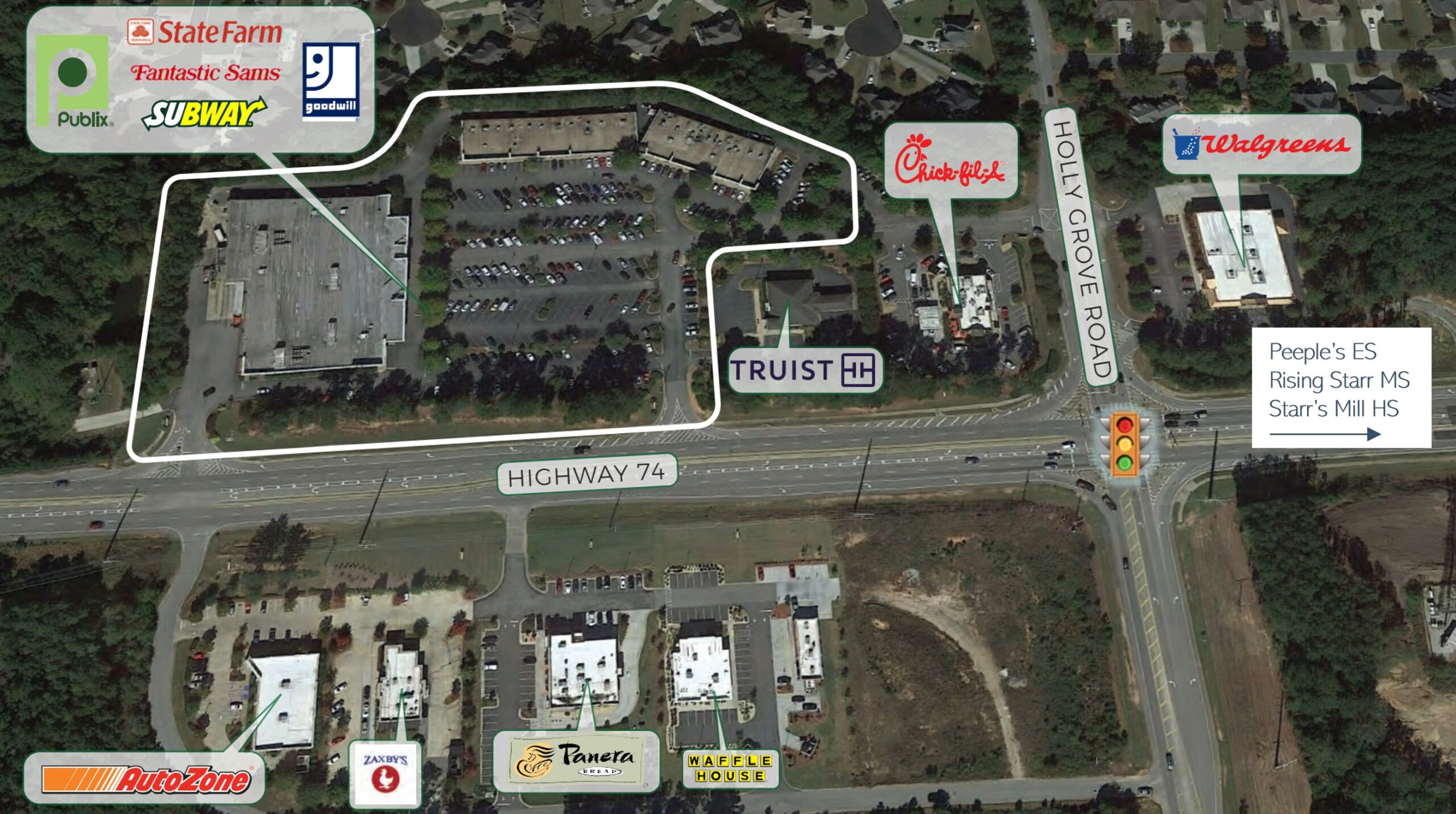 Wilshire Pavilion is prominently located at the intersection of Highway 74 and Holly Grove Road, a key corridor in Peachtree City—an affluent, master-planned community in south metro Atlanta known for its 90 miles of golf cart paths, top-ranked schools, and three lakes totaling 1,160 acres. The project borders Wilshire Estates, a 248-home neighborhood that is fully integrated into the city’s 70-mile multi-use path system for golf carts, biking, and pedestrian access.